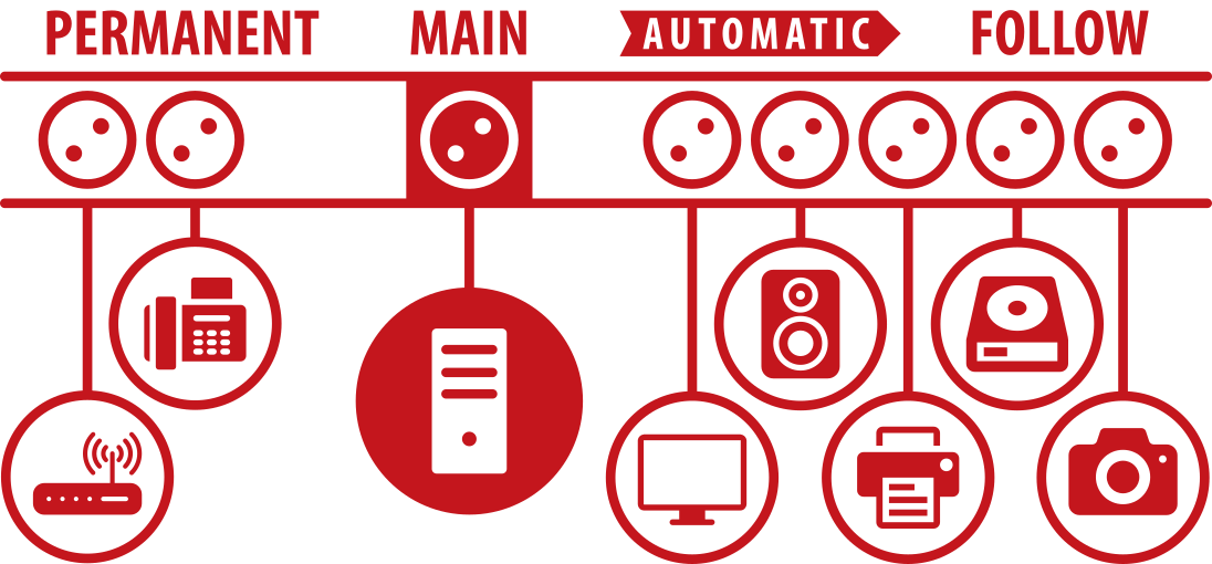 - Mit dem Ein/Aus Schalter des Gerätes, welches in der Main-Steckdose eingesteckt ist, können alle Geräte in den Follow-Steckdosen automatisch mit ein- und ausgeschaltet werden.