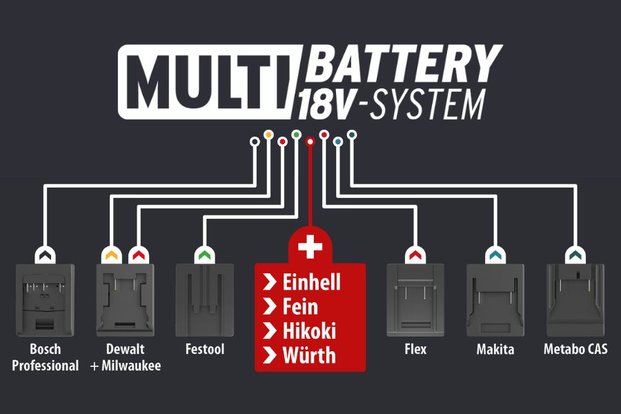 Les projecteurs de travail à LED du système brennenstuhl® Multi Battery 18V sont désormais compatibles non seulement avec les systèmes de batterie des fabricants Bosch Professional, Dewalt, Festool, Flex, Makita, Metabo CAS et Milwaukee, mais aussi avec les marques Einhell, Fein et Hikoki.